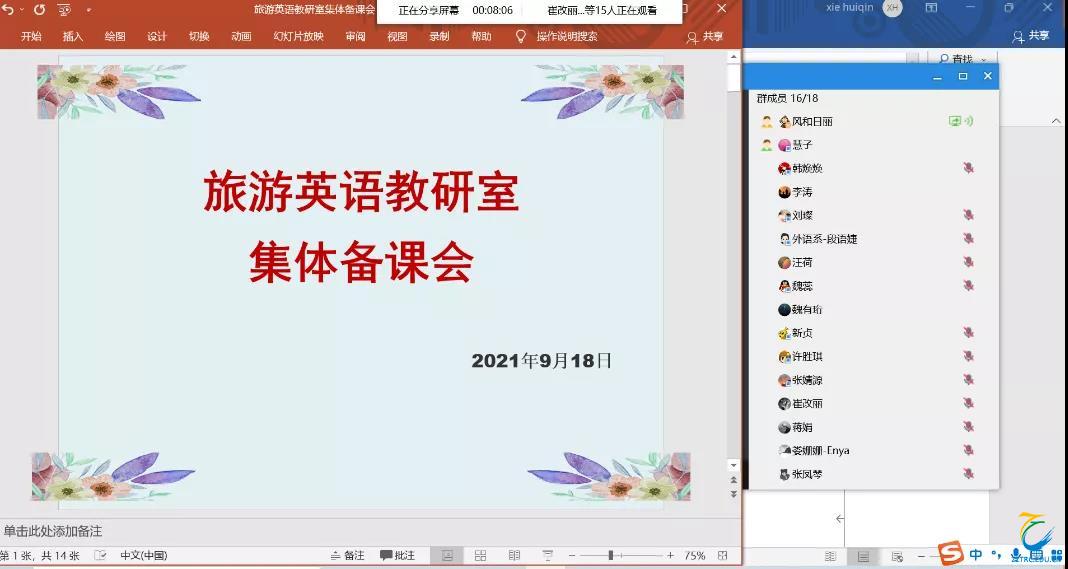 2021年9月18日,旅游英语教研室的教师们参加了全国职业院校旅游大类课程思政集体备课会,首先上午没课的教师报名观看了教育部高等学校思想政治理论课教学指导委员会“高职高专思政课”分教指委主任委员、首都经贸大学书记韩宪洲、世界旅游联盟副秘书长王昆欣等专家的政策领学与解读;并听取了教学名师(团队)对课程思政教学设计方法等,对教师目前课堂教学的改革创新有很好的促进作用。下午,旅游英语教研室组织教师开展线上研讨,针对近期开展线上课程所积累的好的经验和做法进行了积极的分享交流。