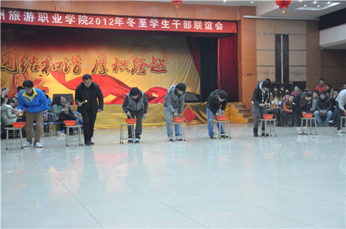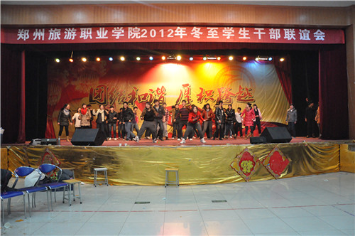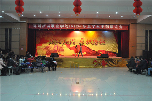 为感谢各系学生干部一学期辛苦的付出,加强我院领导老师、团委学生干部同各系学生干部的交流,2011年12月20日下午6点30分,由院团委组织的“郑州旅游职业学院2012年冬至学生干部联谊会”在我院三楼礼堂举行,院团委书记毛艳老师参加了本次活动,我院团委学生干部及五个系的团总支干部、社团、院学生会等学生干部参加了本次联谊会。