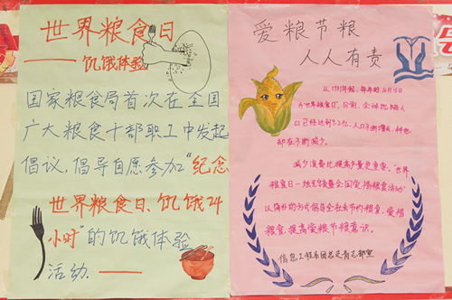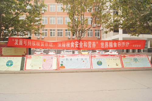 团委通过展板、广播、板报等形式进行宣传,各系团总支积极参与,精心制作宣传展板并于西教学楼前展出各系制作的展板,本次宣传活动共展出了八块展板,分别从“世界粮食日的由来”、“世界粮食种类及分布情况与粮食危机”、“中国粮食种类及分布情况与中国出口粮食种类及分布情况”、“世界对粮食贫瘠地区的资助”、“珍惜粮食的意义”、“世界粮食日的主旨目的”、“人们对于‘认识粮食’的理解”、“‘饥饿体验’带给大家的感受”八个模块进行宣传。