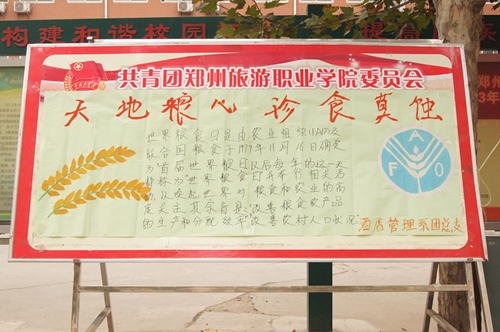为了早日实现习总书记提出的“中国梦”,郑州旅游职业学院青年志愿者协会在2013年10月16日“世界粮食日”当天开展了以“发展可持续粮食系统,保障粮食安全和营养”为主题的宣传活动。