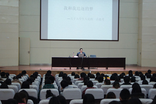 2013年12月18日16时,郑州旅游职业学院第九期入党积极分子培训班“我和我追逐的梦”专题讲座在西报告厅如期举行,学院各小组共四百余名入党积极分子参与其中,本次讲座由组织部部长闫浩主讲,院团委书记朱宇主持。