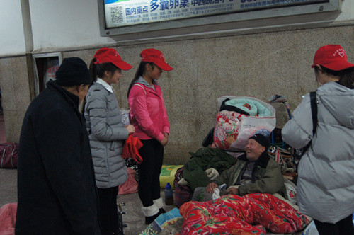 为展现我院青年志愿者良好的精神风貌,弘扬奉献、友爱、互助、进步的志愿精神,使青年志愿者们感受到为人民服务的快乐和满足,学会关心他人,担得起当代大学生的责任。4日下午1点,志愿者集合完毕。14名志愿者共分成两支小分队,分别来到汽车站和火车站。当志愿者们看到了流浪者时,热情的送上衣服和食物,并问候流浪者的身体状况,一件件衣服温暖着流浪者的心灵,一声声的道谢让志愿者的心中更充满力量。