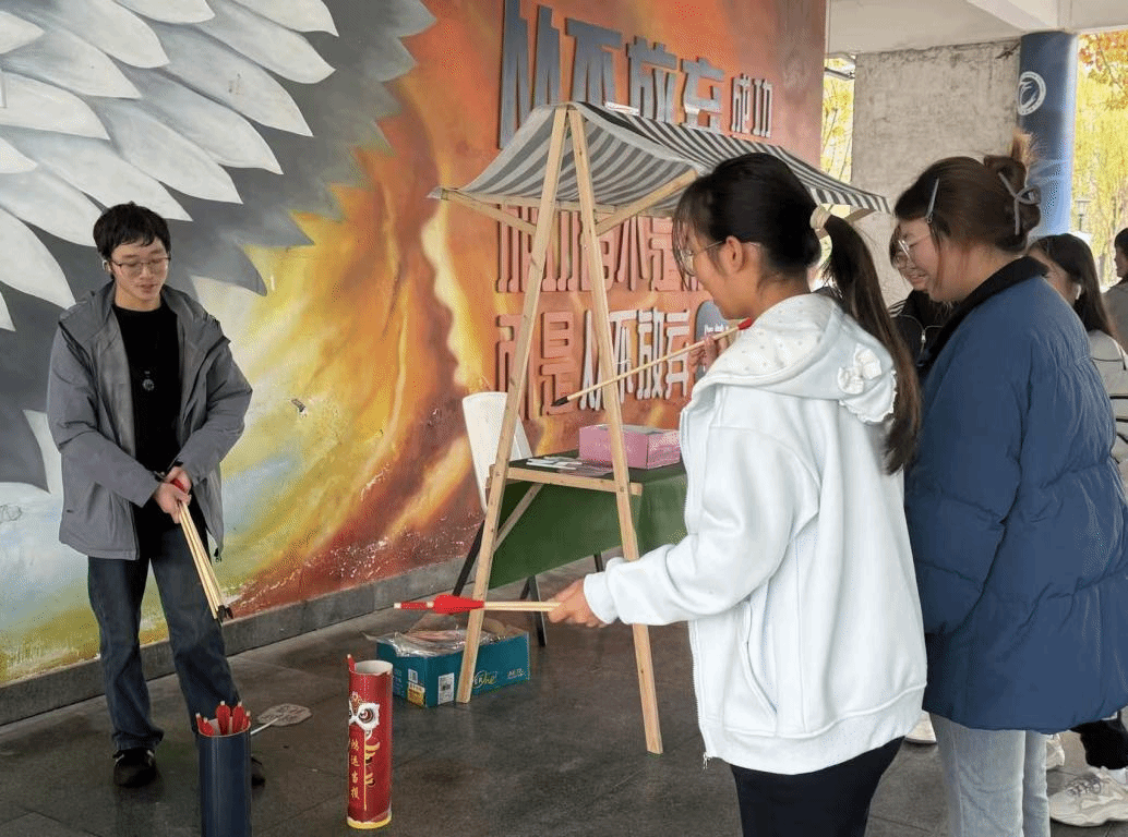 互动体验区同样人气高涨,投壶送礼与狼人杀两大活动吸引了众多学子踊跃参与。投壶摊位前,同学们凝神聚力、瞄准投箭,欢声笑语中体验传统游戏的雅趣,成功投中者收获了惊喜小礼品;狼人杀现场则氛围紧张又欢乐,大家凭借清晰的逻辑推理与流畅的语言表达展开博弈,在沉浸式互动中增进了同窗情谊,培养了团队协作意识。此外,烹饪专业学生也在这里开展免费葱油饼试吃活动,与趣味十足的互动体验区形成巧妙呼应,让“有吃有玩”成为现场最鲜明的标签,刚出炉的大饼色泽金黄诱人、咸香适口,瞬间征服了大家的味蕾。