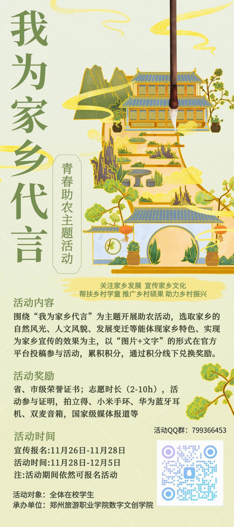 郑州旅游职业学院数字文创学院青年志愿者协会联合西安市乡村发展公益慈善基金会·助学助农公益基金开展“我为家乡代言”活动。无论你是土生土长的家乡人,还是与这片土地结下缘分的异乡客;无论你擅长镜头叙事、文字抒情,还是热爱口语表达、创意设计——只要你心中有对家乡的热爱,就能成为家乡的“首席推荐官”!