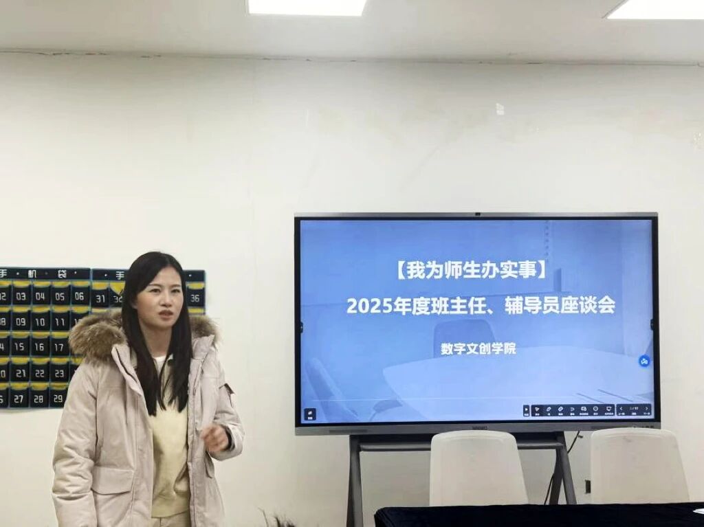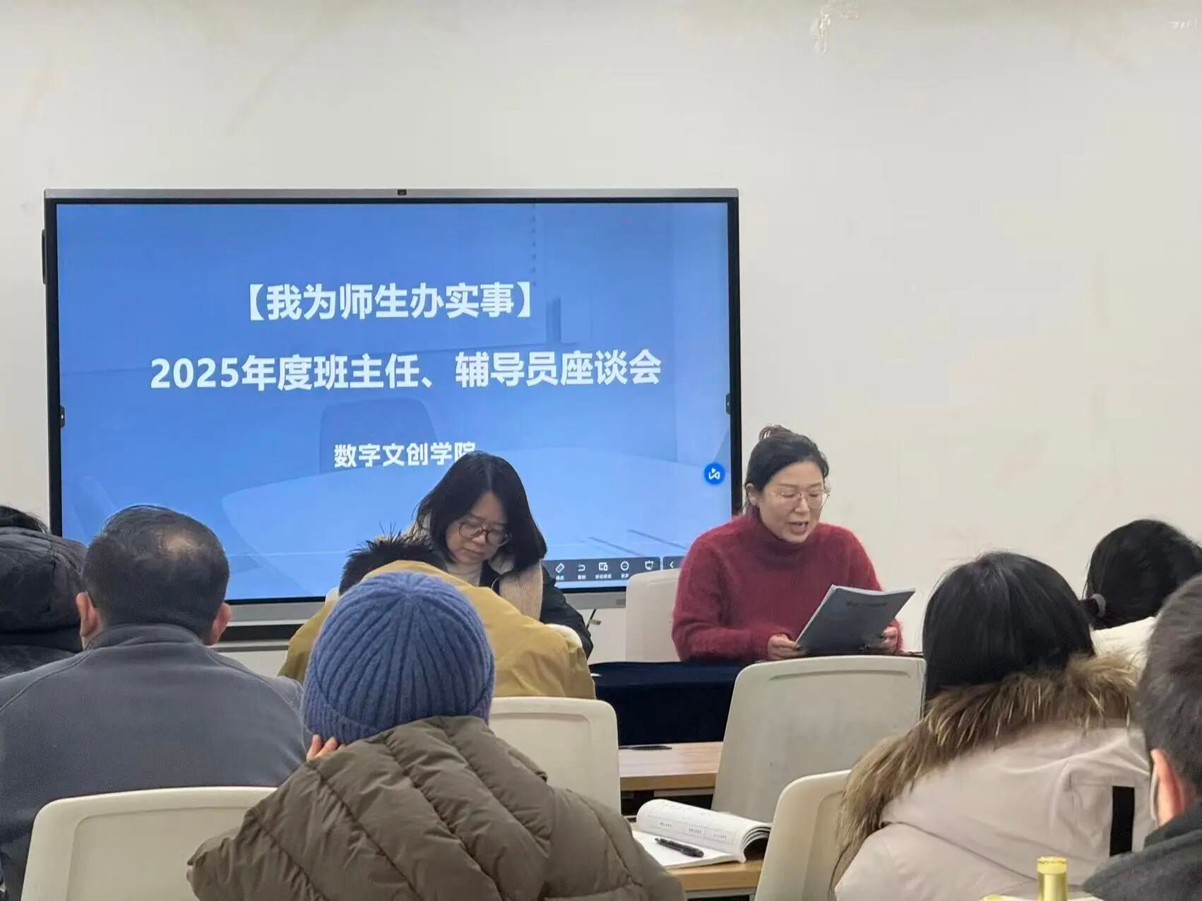 为进一步加强班主任、辅导员队伍建设,凝聚育人共识,提升学生教育管理服务质量,2026年1月7日下午,数字文创学院在7B102会议室召开了班主任、辅导员座谈会。学院党总支书记杨慧丽及全体班主任、辅导员参会交流,党总支副书记冯思源主持会议。