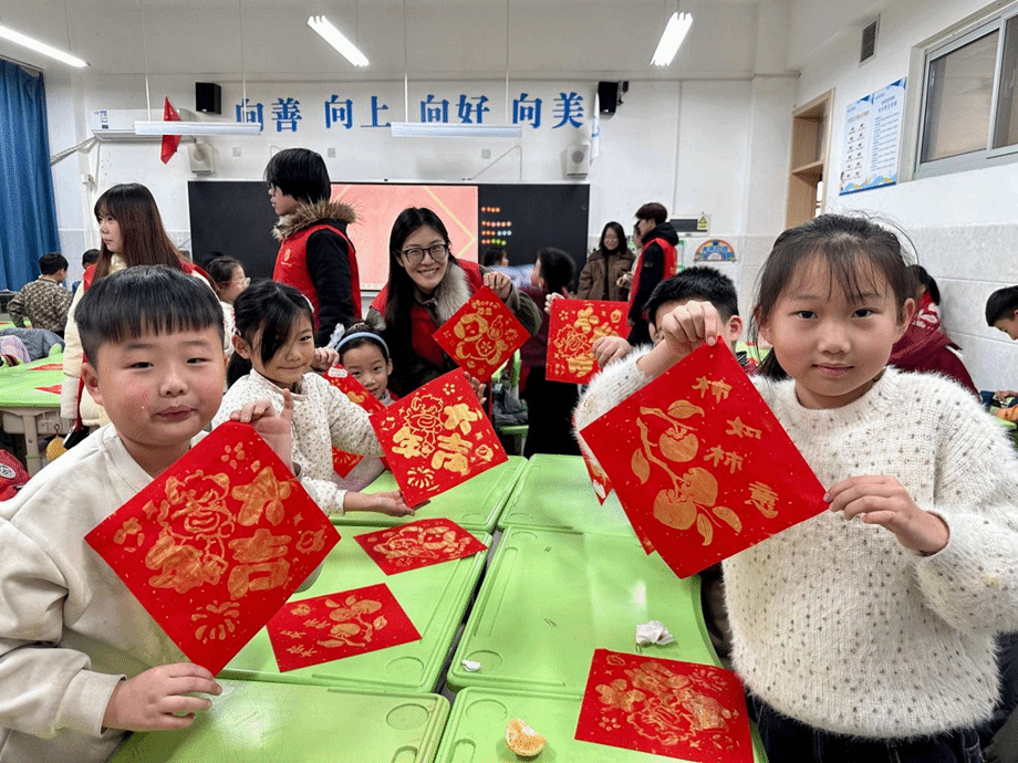 分组实践环节,志愿者们与孩子们迅速分成小组。他们手把手耐心指导,孩子们则全神贯注地操作着。不一会儿,一张张承载着美好祝福的福字在孩子们手中诞生,那墨香四溢的福字,仿佛是传统文化在孩子们心中种下的希望之花。活动尾声,大家纷纷自豪地展示自己的作品,并一起拍摄了大合照,将这充满欢乐与文化气息的瞬间永远定格。