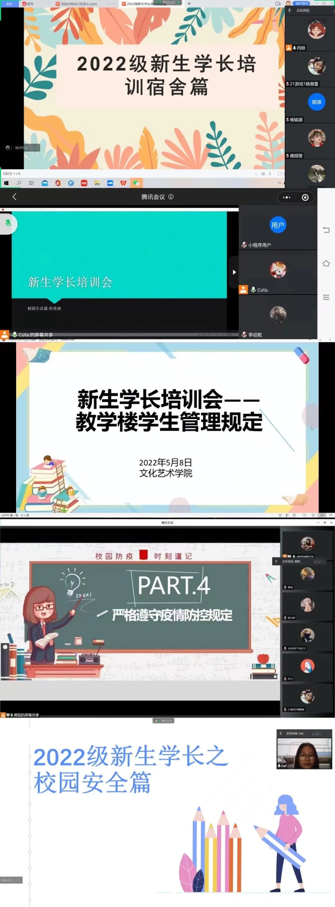为让2022级新生学长充分明确自身工作职责,更好引导新生,郑州旅游职业学院文化艺术学院开展为期十天(5月3日—5月12日)的2022级新生学长、班副培训大会,参加此次培训的学生共计63人,主讲老师分别是辅导员姜力元、闫晗、杜欣雨、焦伟丽。
