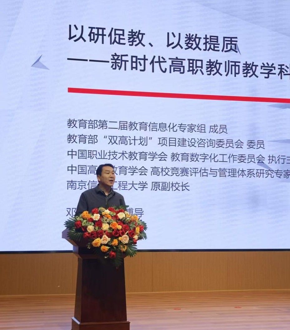 培训中,邓志良教授以“以研促教、以数提质”为核心主题,围绕四大核心模块展开深度讲解。从国家职业教育改革政策高度出发,解读新《职业教育法》、“双高计划”等对高职教师教科研能力的硬性要求,明确高职教科研“以岗位为核心、侧重教学改革与产教融合”的特色定位,邓教授从“教学出题目、科研做文章、成果进课堂、服务进产业”讲解了横向课题低门槛切入点、教学成果奖全周期培育路径等可直接落地的实操方法,配套职教领域真实案例解读,让教师们学有方法、做有指引。同时,他紧扣职业教育数字化战略要求,讲解大数据学情分析、虚拟仿真技术等在教科研中的应用,为教师们打通数字化赋能教科研的实践路径。