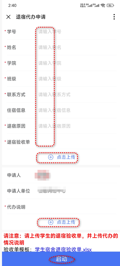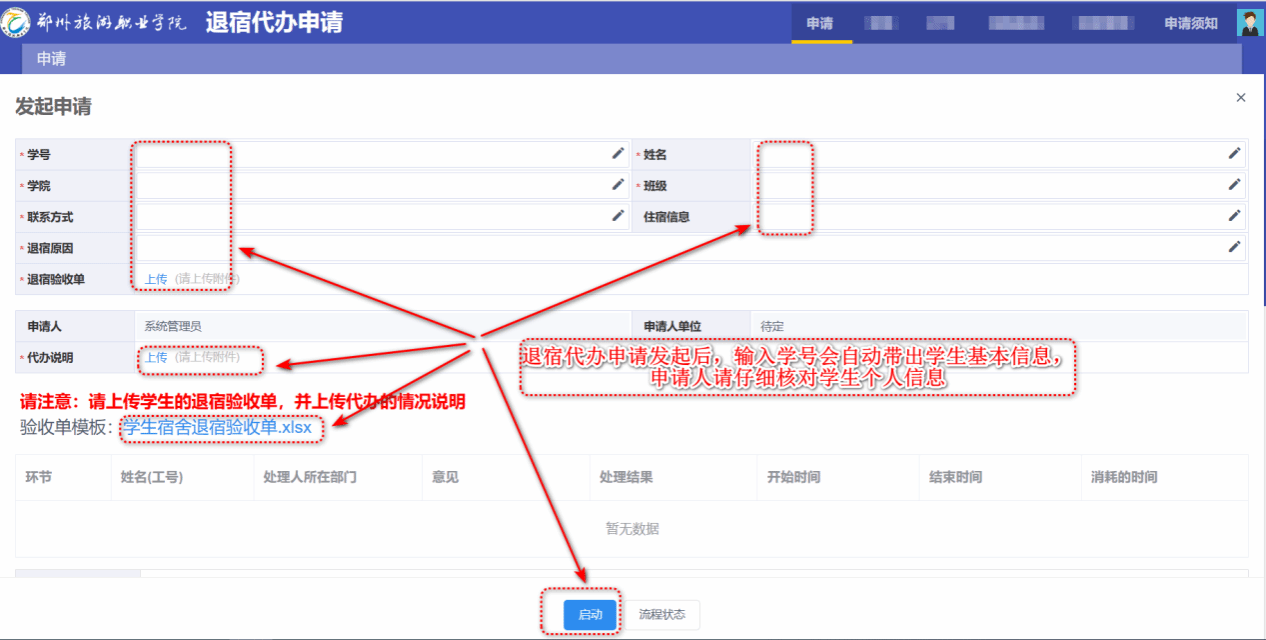 进入申请页面后,按要求逐项填写相关信息(输入学号会自动带出学生基本信息,申请人请仔细核对学生个人信息,确保与实际情况一致),上传必要的佐证材料,核对信息完整无误后点击 “启动”,完成线上申请操作。