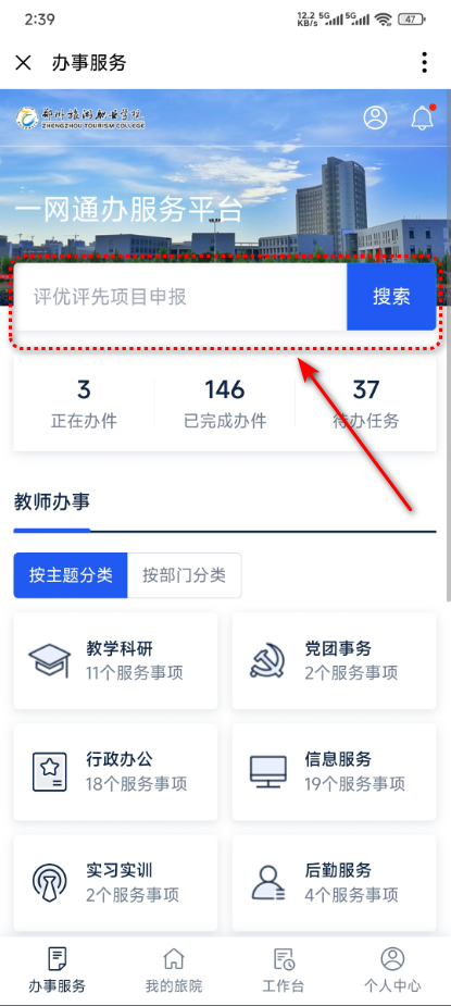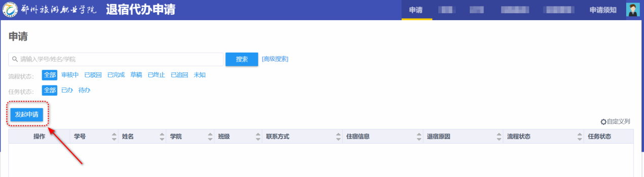 登录一网通办平台,在首页搜索框中输入关键字 “退宿代办申请”,在列出的服务列表中点击选中,直接打开申请页面;