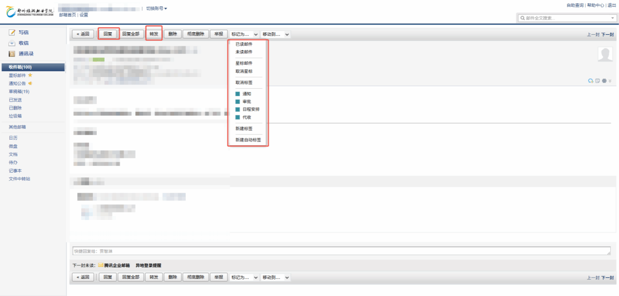 处理邮件时,可进行「回复」「转发」「标记已读/未读」「星标收藏」操作,操作方式与个人邮箱一致;