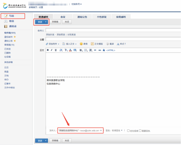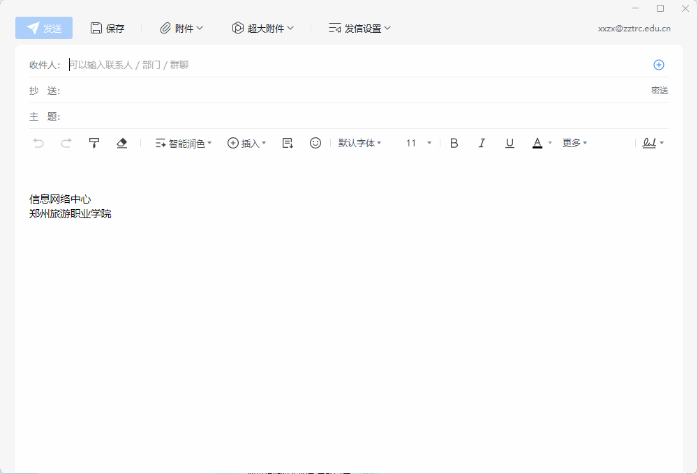 登录公共邮箱后,点击左侧「写信」按钮;在「发件人」栏,确认显示为公共邮箱账号(如hr@zztrc.edu.cn),若显示个人账号,可点击下拉切换;输入收件人、主题、邮件内容,可添加附件(支持拖拽上传,单封邮件附件大小限制以企业设置为准);可设置「抄送」「密送」「定时发送」「邮件签名」(签名可在设置中提前配置);点击「发送」,邮件将以公共邮箱名义发送,所有有权限的成员均可在「已发送」中查看。