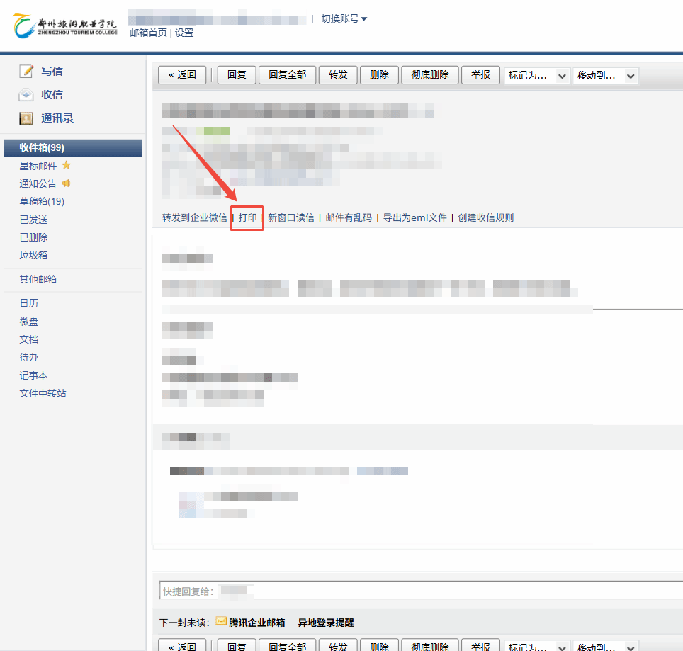 打印邮件:点击单封邮件进入详情页,点击「打印」即可完成打印(目前网页端仅支持单封邮件打印);