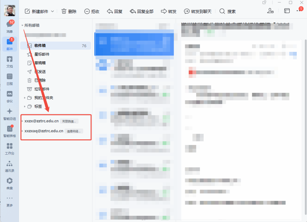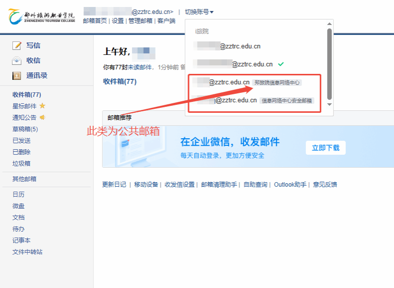 在邮箱列表中,找到已分配权限的公共邮箱账号,点击即可切换至公共邮箱;
