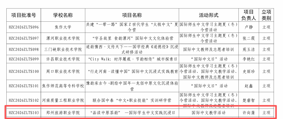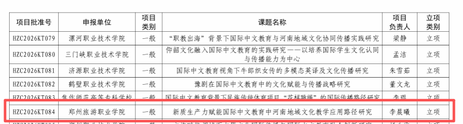 根据河南省教育厅办公室《关于开展2026年河南省国际中文教育研究与实践课题立项申报工作的通知》(教办外〔2025〕211号)、《关于开展2026年河南省国际中文教育质量提升项目立项申报工作的通知》(教办外〔2025〕218号)要求,省教育厅组织开展了有关项目的申报遴选工作。经个人申报、学校推荐、资格审查、专家评审、网上公示等程序,我校立项一项国际中文教育研究与实践课题立项和一项国际中文教育质量提升项目。请立项项目积极开展工作,参照结项条件(见附件)按时结项。现将立项名单予以公布。
