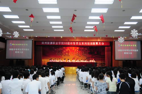 随后,陈锡畴院长为全体学生作了本次系列培训教育大会的第一讲。陈锡畴院长向2008级中专的同学们介绍了学院的发展历程和成就,并引导同学们了解人生成功的基本要素,勇于面对,不断努力,融入世界、融入国家、融入集体,与祖国同命运共成长。学生处闫浩处长还向同学们介绍了《郑州旅游职业学院学生日常行为规范》。