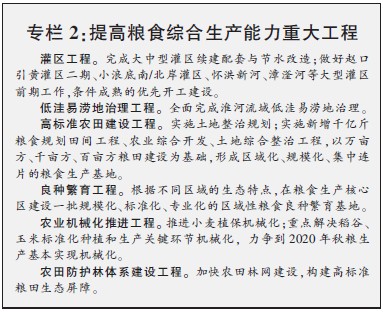 依托纳入全国新增千亿斤粮食生产能力规划的县(市、区),建设黄淮海平原、南阳盆地、太行山前平原、汾河平原优质专用小麦和优质玉米、水稻、大豆、杂粮产业带,大幅提高吨粮田比重,建设粮食生产核心区。加强农产品主产区耕地保护,稳定粮食播种面积。推进大中型水库和灌区建设,加大低洼易涝地治理、病险水库除险加固和大型灌排泵站更新改造力度,增强抗御旱涝灾害能力。加快高标准农田建设和中低产田改造。实施粮食丰产科技工程,建设一批粮食科技示范区。加快超高产新品种选育推广,建设全国小麦、玉米、水稻育种创新基地。推进农业机械化,提高粮食耕种收综合机械化水平。推进整建制粮食高产创建,实施提高粮食综合生产能力重大工程,打造20个粮食生产能力超20亿斤、25个15亿—20亿斤和60个10亿—15亿斤的粮食生产大县,建设区域化、规模化、集中连片的国家商品粮生产基地。