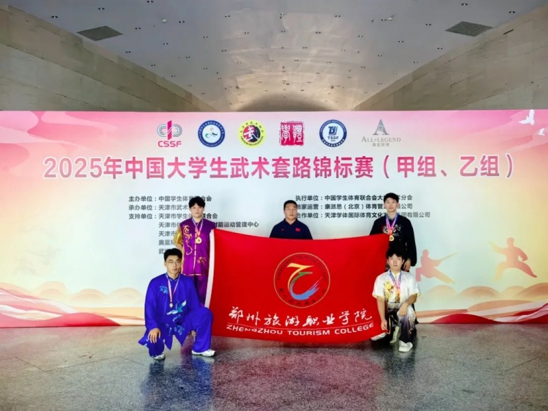 7月25日至7月31日,2025年中国大学生武术套路锦标赛(甲组、乙组)在天津市武清区盛大举行,经过激烈角逐,郑州旅游职业学院武术代表队最终取得四枚金牌、一枚铜牌、两个第四名、一个第八名的好成绩,同时还获得了“体育道德风尚奖”、“优秀教练员”、“优秀运动员”等荣誉。