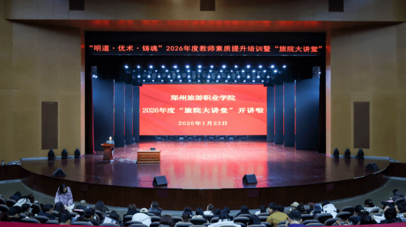 为全面落实立德树人根本任务,持续加强师资队伍建设,全面提升全体教职工思想政治素质、教育教学能力和育人水平,1月23日,郑州旅游职业学院“明道·优术·铸魂”2026年度教师素质提升培训暨“旅院大讲堂”启动仪式在艺术中心举行,全体教职工参加本次培训。