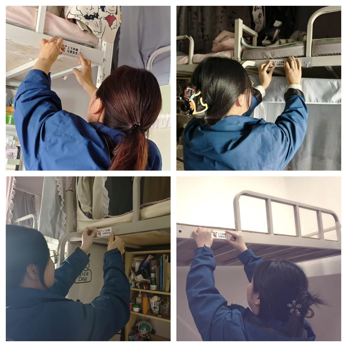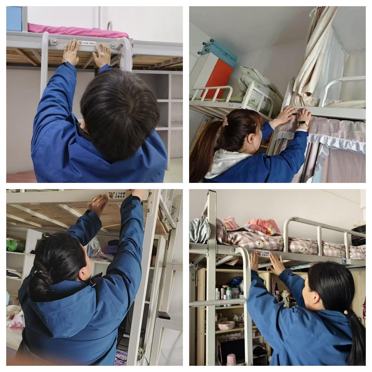 公寓管理员作为校园安全的“守护者”和“贴心人”,承担了具体的张贴工作。他们逐一走访宿舍,不辞辛劳地将提示贴精准粘贴在每一间宿舍床梯的附近的合适位置,确保同学们进出、休息时能清晰可见。这一细致入微的动作,不仅是落实安全管理的职责,更是传递了学校对每一位住宿生细致入微的关怀。