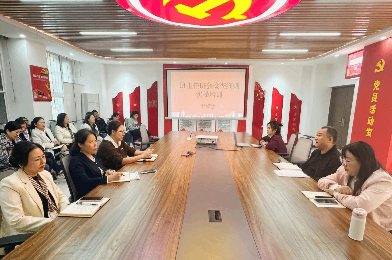 为切实抓实学生教育管理工作,进一步规范班会组织流程、提升班主任育人质量与效率,10月15日,信息工程学院在103会议室,召开班主任班会检查细则实操培训会。学院党总支书记周鹏、团总支书记李舒、学工办代主任付佳及全体专职辅导员、班主任共同参会。