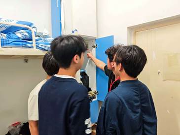 随后,新生学长和班副逐间排查宿舍插座线路及电器使用情况,精准整改问题。对插线板超负荷使用现象,现场演示功率分配技巧规避短路风险;对堆放纸箱、衣物等易燃物的角落,协助清理并详解连锁隐患。