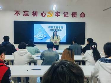 为深入推进全民国家安全教育日宣传活动,引导广大青年学生牢固树立国家安全观,凝聚维护国家安全的青春力量,4月8日下午,信息工程学院在4A121以“国家安全,青春挺膺”为主题隆重举行国旗下演讲比赛。党总支副书记李舒,辅导员陈新出席了本次活动。