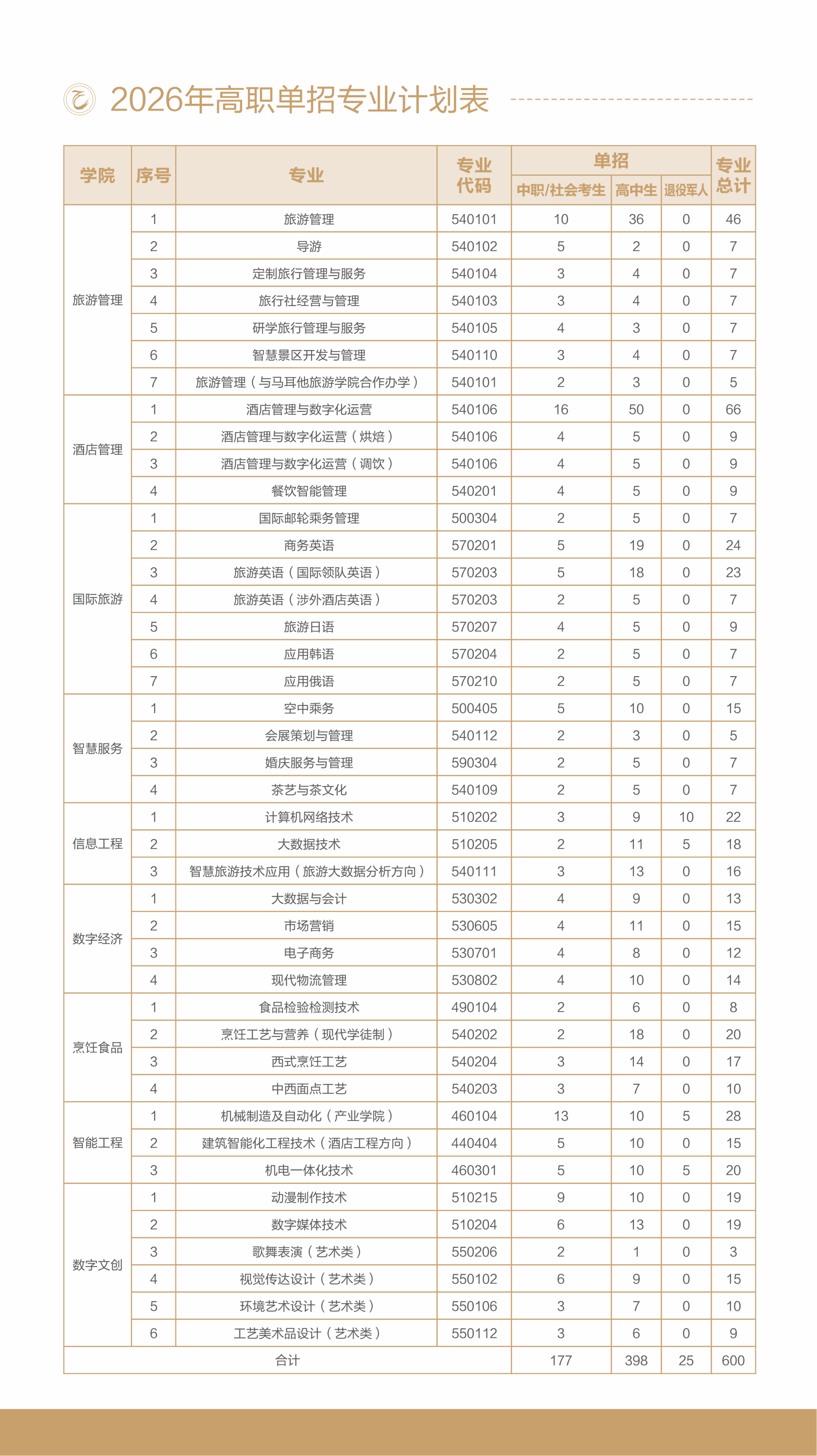 总计划600人,共 42 个专业。其中高中生计划 398 个,中职生与社会考生计划共用 177 个,退役士兵计划 25 个。专业分为提前批(4 个艺术类专业,歌舞表演、视觉传达设计、环境艺术设计、工艺美术品设计)和普通批(38 个专业)。