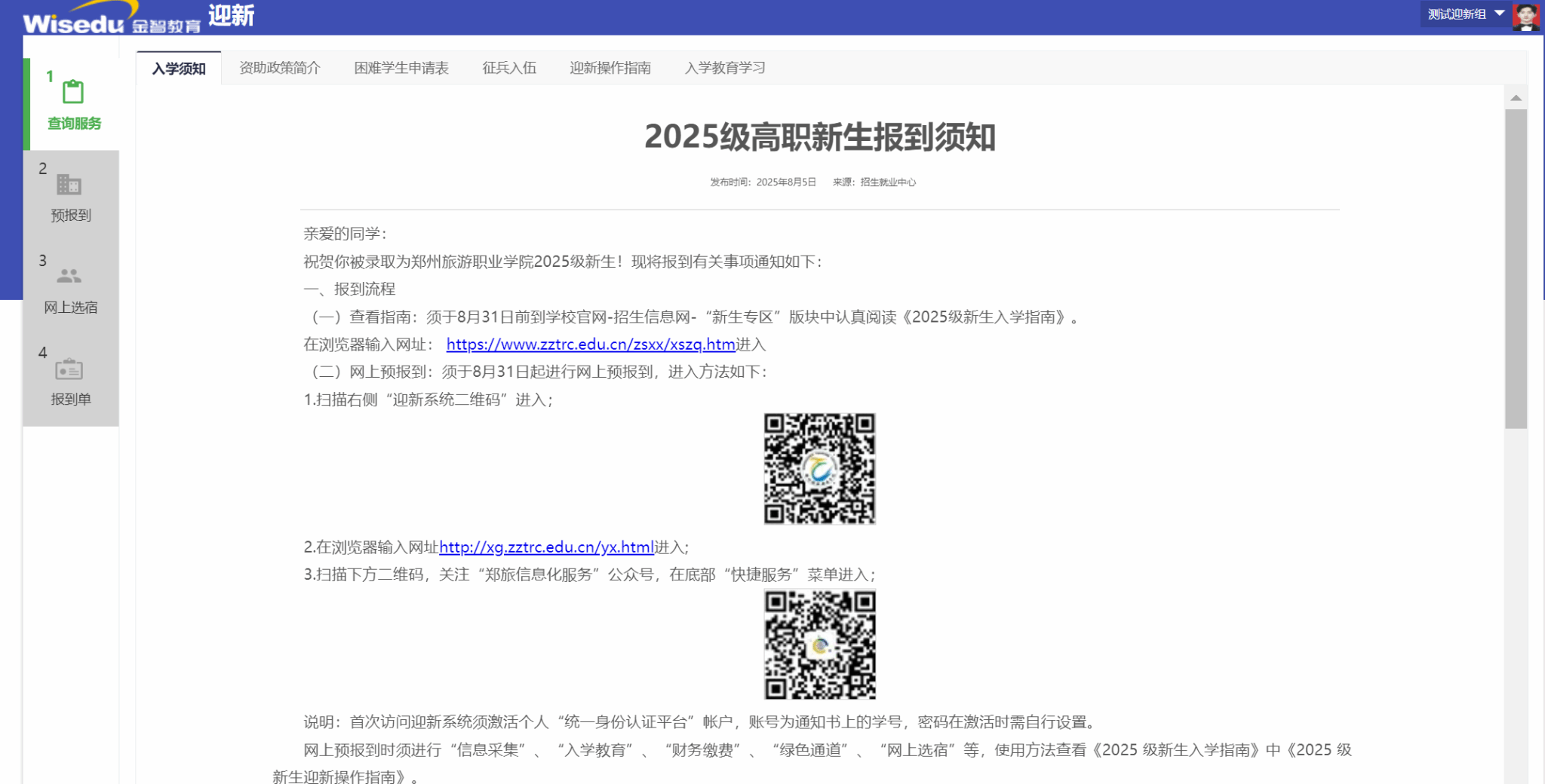 以手机为例,手机关注“郑旅信息化服务”公众号(图1),在底部【快捷菜单】中点击【新生迎新】进入;或通过扫描迎新二维码访问(图2)。