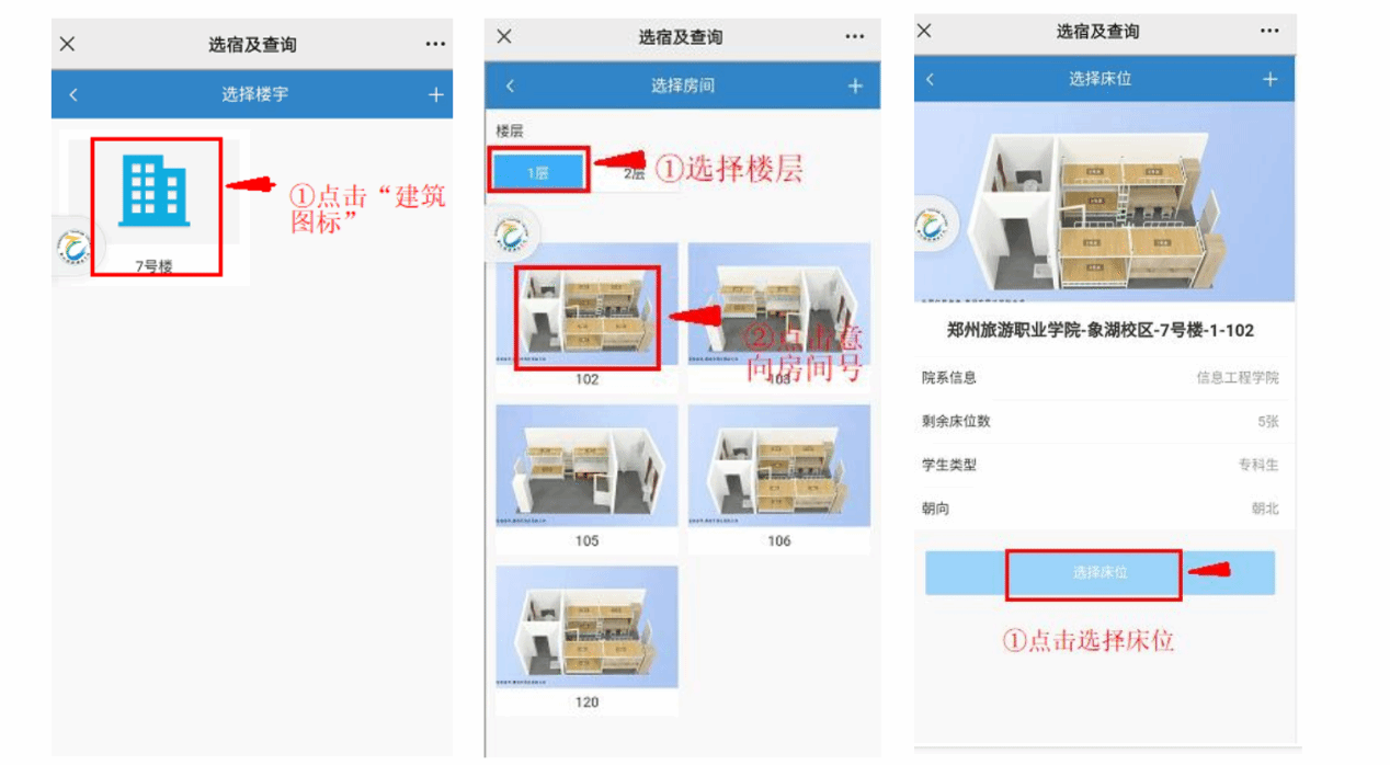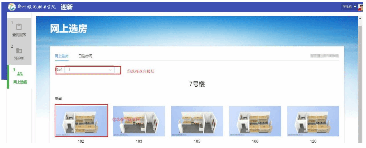 如下图所示:点击意向“宿舍楼”对应图标,选择意向楼层,显示可选房间信息。