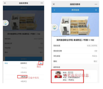点击“房间”图标,显示该房间的参考示意图、简要信息及可选床位信息。单机选择意向床位图标,如“1号床位”,选中床位按钮则会突出显示,点击“提交”按钮,再次确认所选床位,单击“确定”后则选房成功。