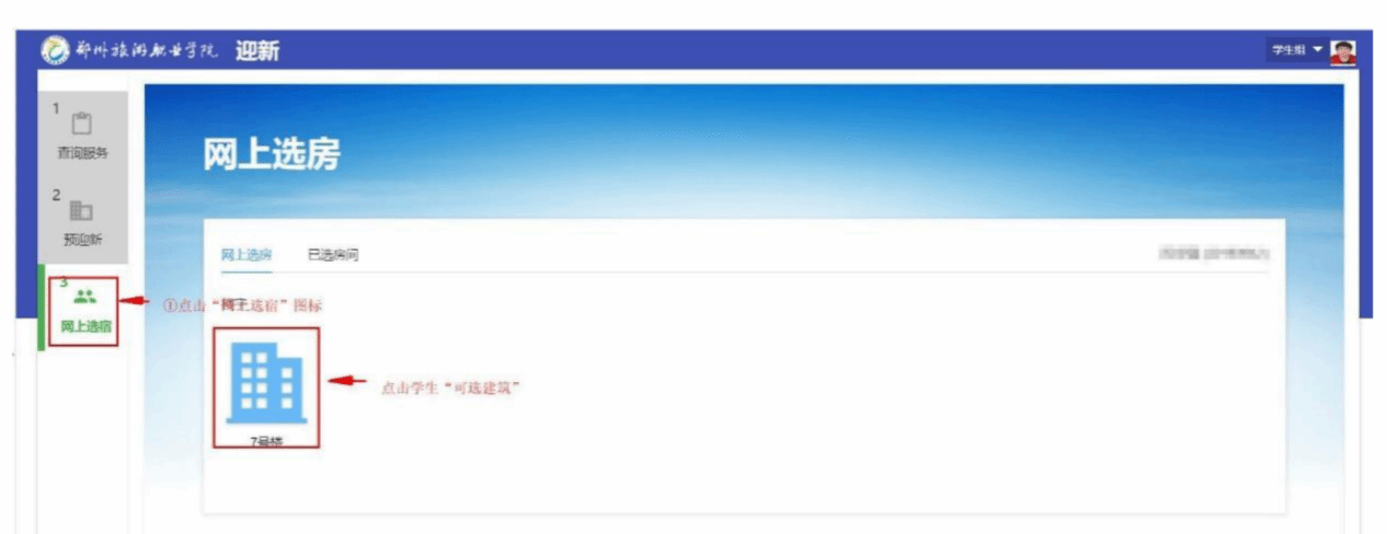 迎新系统的网上选宿功能与学校宿管系统联动,点击左侧【网上选宿】后,将自动打开宿舍系统网上选房功能。