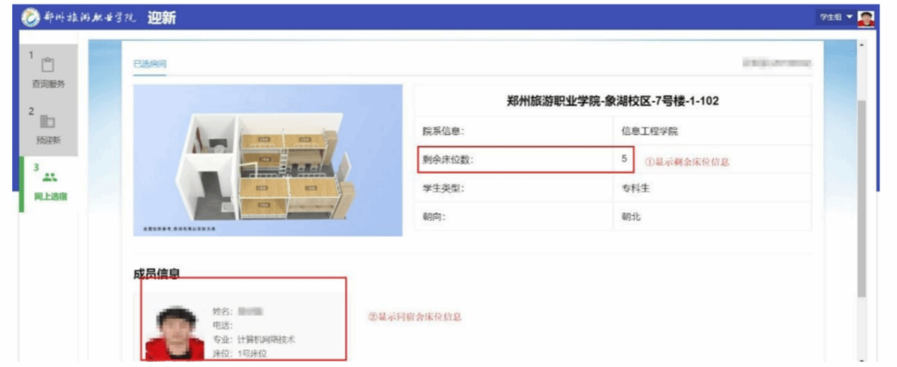 后期新生可通过网上选房首页的【已选房间】功能,查看该房间各床位的入住情况。